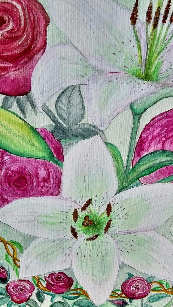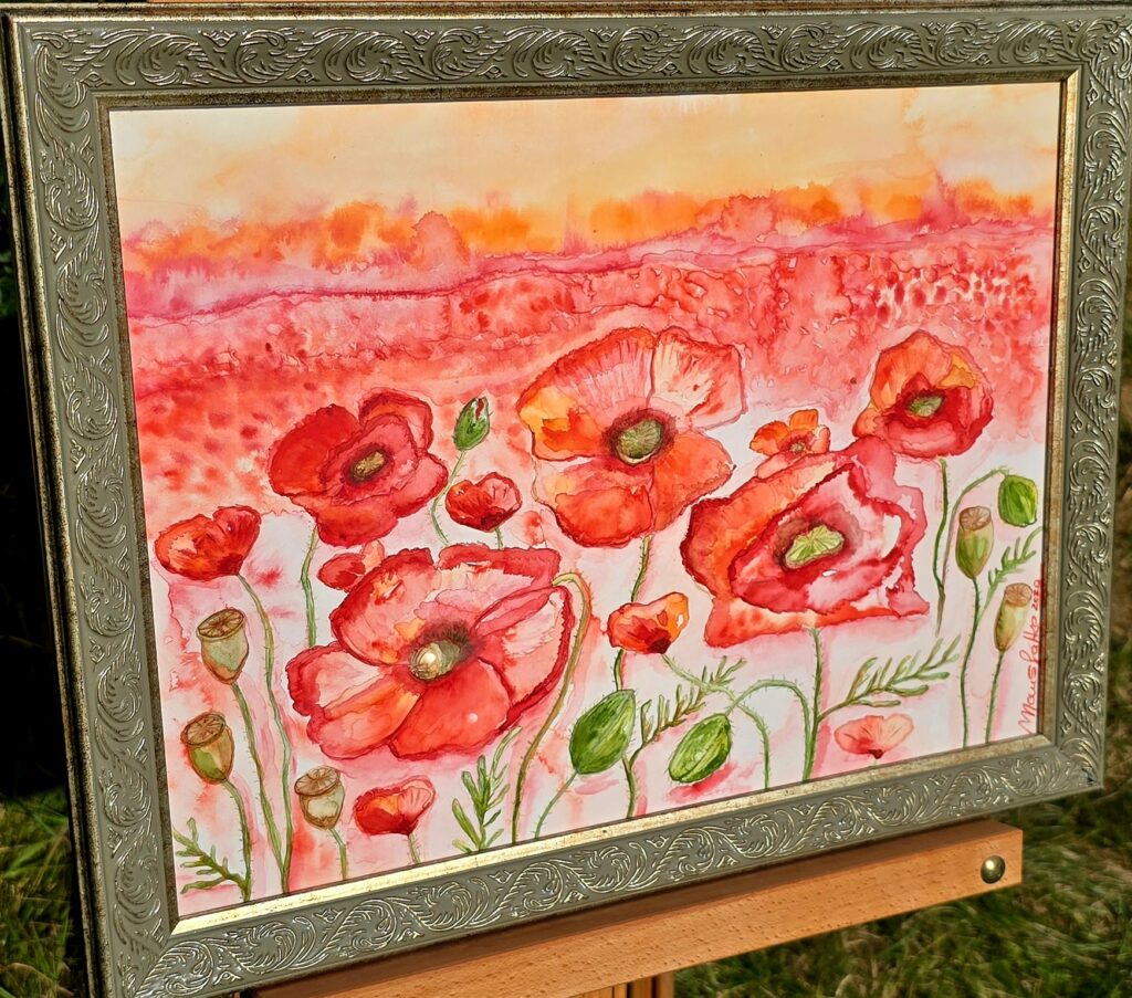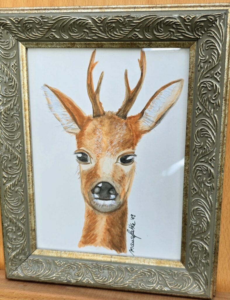 Wildblumen an der Steilküste🌸🌼, Aquarell, 30×40 cm, 2019Mohnblumenfeld🌸🌸🌸 Aquarell 30×40 cm, 2020 Rehbock🦌Aquarell, 17×24, 2019Wolf🐺 Ölgemälde, 60×60 cm, 2019Weiße Lilien💮💮💮 Aquarell 24×32 cm, 2019Be free 🦋 Aquarell 17×24 cm, 2025